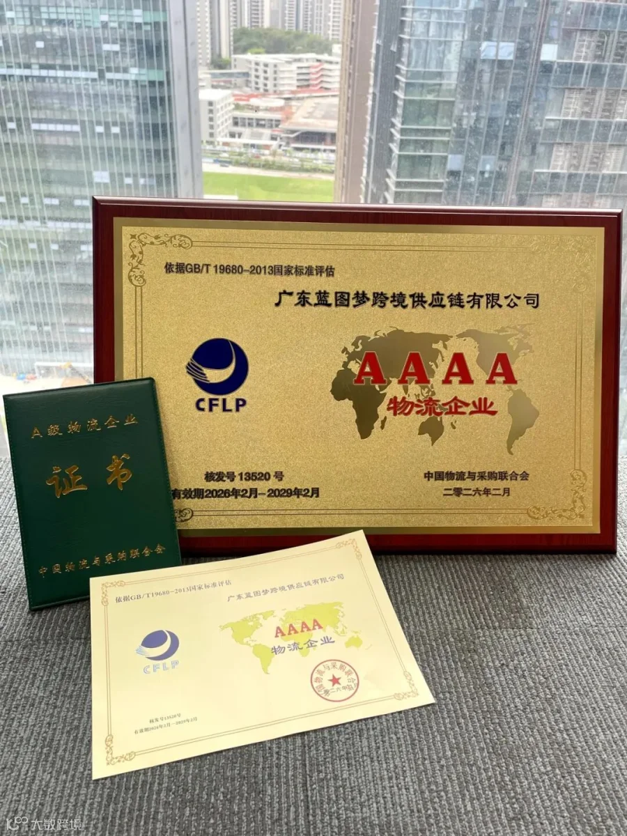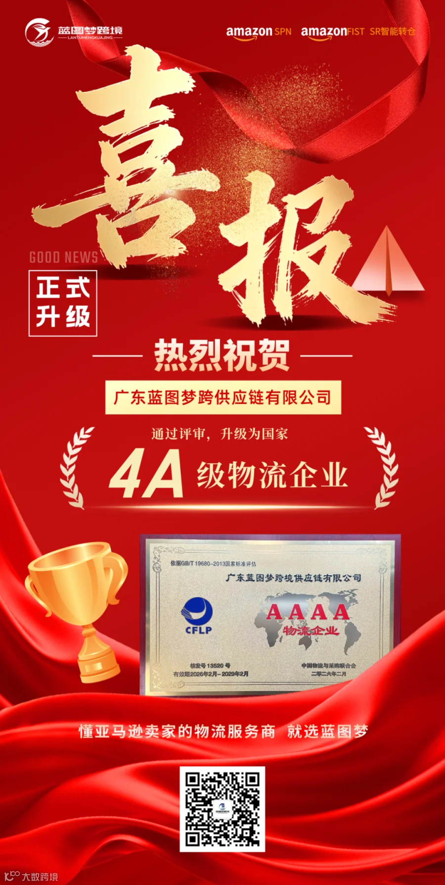 广东蓝图梦跨境供应链有限公司正式通过中国物流与采购联合会评审,升级为国家"4A级物流企业"。该认证依据《物流企业分类与评估指标》(GB/T 19680-2013)国家标准,是国内物流行业最具公信力的权威资质认证。
