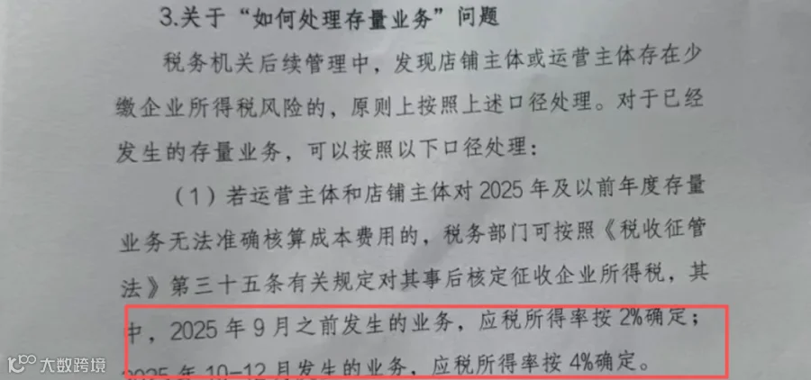 - 历史旧账处理:2025年9月前业务按2%应税所得率核定,10-12月按4%核定。