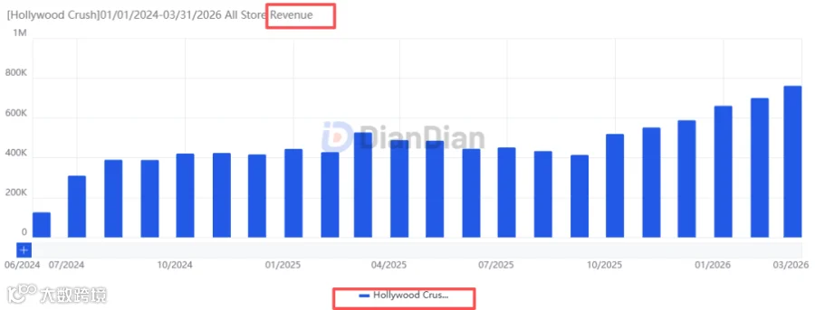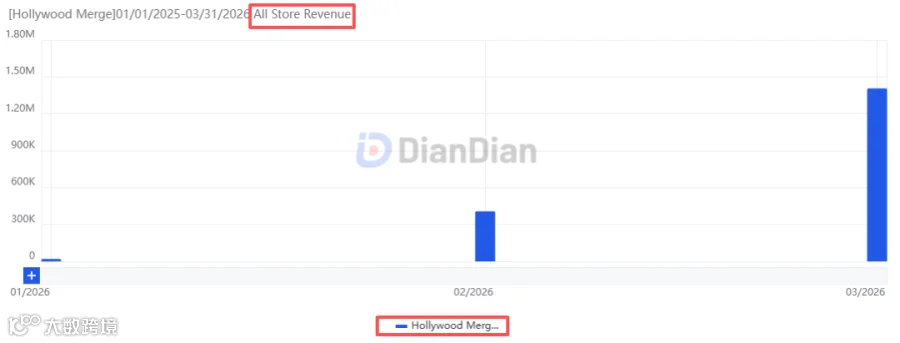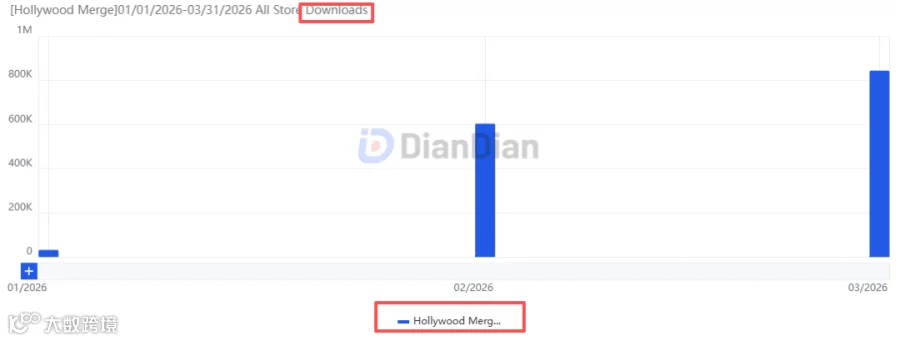 《Hollywood Merge》最早于2025年8月中旬在欧美等地区Google Play开启小规模测试,并同步启动素材投放与社媒运营;2026年1月初开放全球预注册,当月起产生可统计数据;2月加大投放并陆续上线App Store,单月下载达60.3万,流水41万美元(约280万元人民币);3月采取缓步扩量策略,下载84.2万(环比+39.6%),流水跃升至141万美元(约960万元人民币),环比增长245.5%。