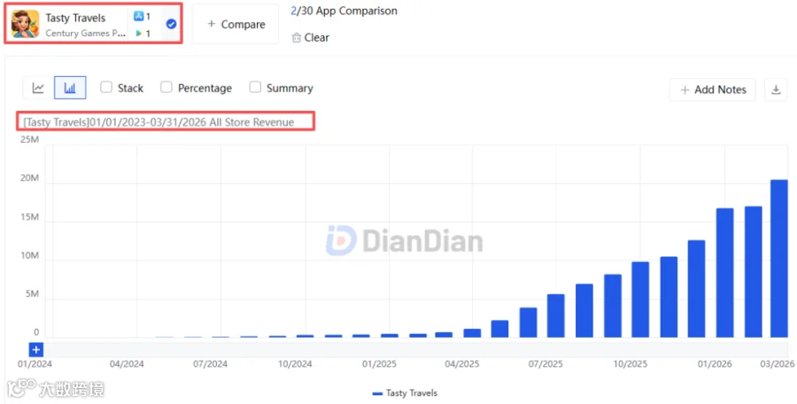 点点互动首款大规模投入的Merge-2产品《Tasty Travels: Merge Game》,于2024年开启测试、2025年5月正式上线,现为全球表现第二的Merge-2游戏,2025年3月流水约2050万美元(约1.4亿元人民币)。