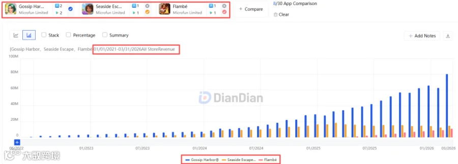 柠檬微趣旗下《Gossip Harbor®: Merge & Story》是当前全球最赚钱的Merge-2产品,2022年6月上线后流水持续攀升,2025年3月达8020万美元(约5.5亿元人民币)峰值;《Seaside Escape®: Merge & Story》(2022年10月上线)近20个月月流水稳定在1200万美元以上(约7000万元人民币);2024年11月上线的《Flambé: Merge and Cook》月流水已达1100万美元左右。