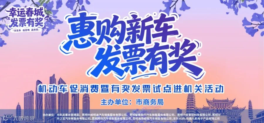 昆明市商务局将于2026年4月28日—29日在市级行政中心综合楼北广场举办"惠购新车·发票有奖"机动车促消费暨有奖发票试点进机关活动。活动联动彩云汽车消费券、汽车以旧换新等政策,旨在激发汽车消费活力。