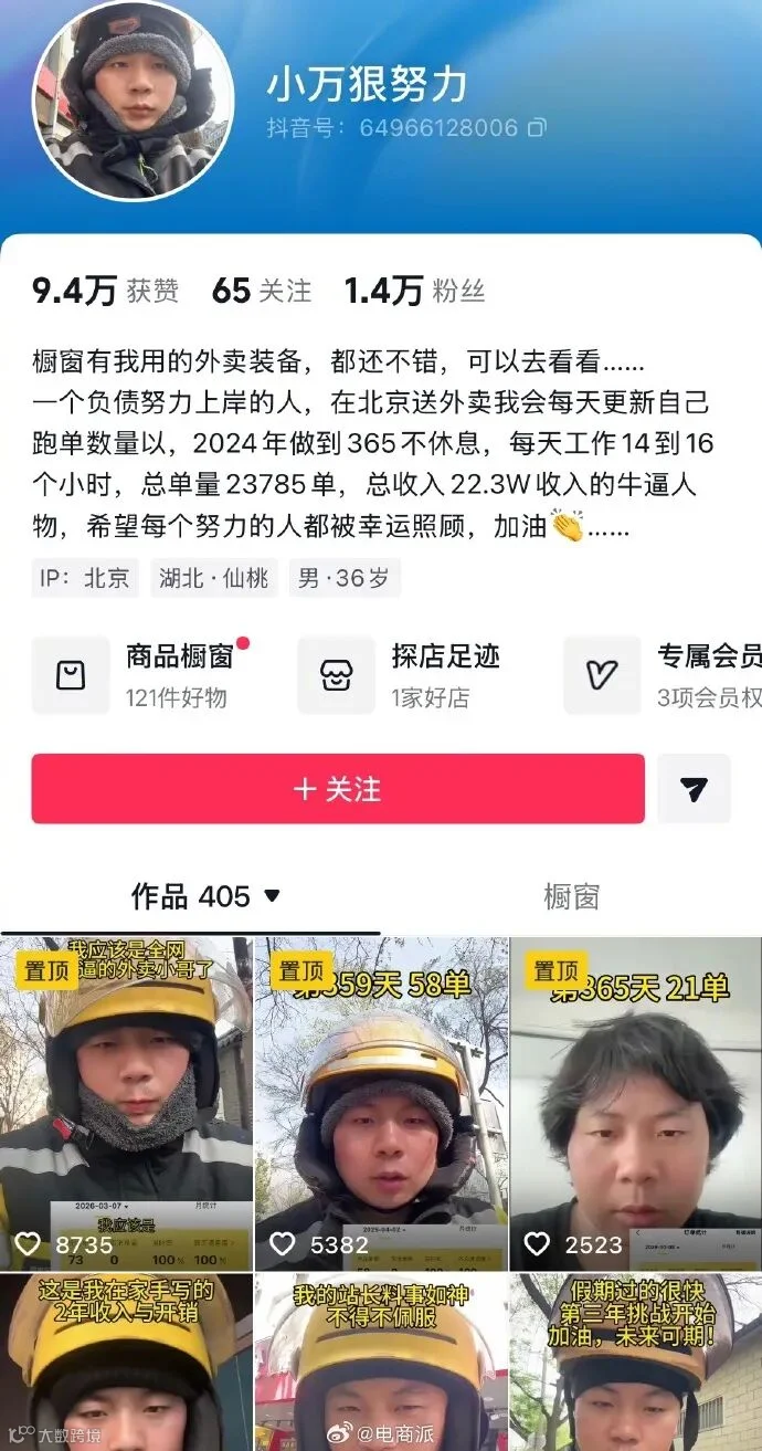 37岁的外卖骑手万灯辉,网名“小万狠努力”,用两年时间完成47393单,累计收入44万余元,还清40万元债务。
