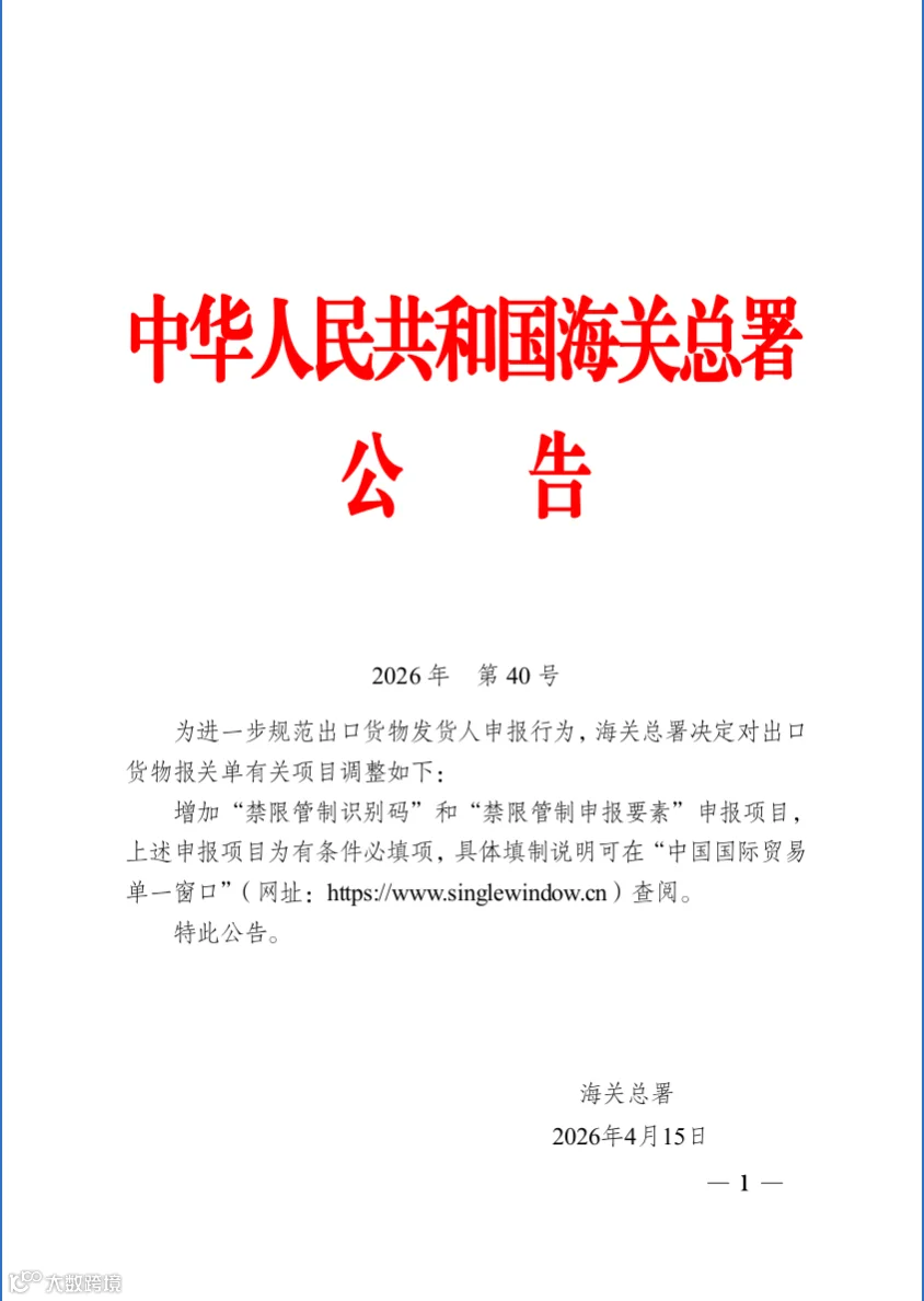 2026 年 4 月 16 日海关总署发布第 40 号公告,新增出口报关单禁限管制识别码、禁限管制申报要素(有条件必填);企业需落实两用物项出口管制合规,合规良好可享通用许可等便利。