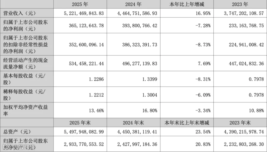 2025年,公司实现营收52.21亿元,同比增长16.95%;归母净利润3.65亿元,同比下降7.28%,扣非净利润同比下滑8.73%。