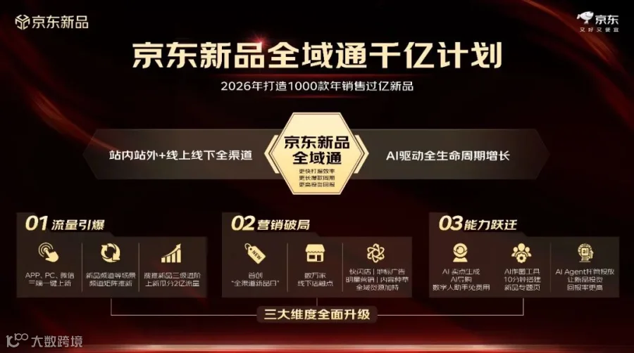 京东同步发布“新品全域通千亿计划”,整合搜索推荐、营销IP、全渠道资源、AI工具及内容生态,目标打造1000款年销过亿新品。