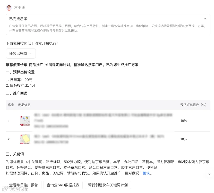 “京小通”支持自然语言交互,提供策略洞察、创意生成、智能投放到诊断优化的全链路AI服务。