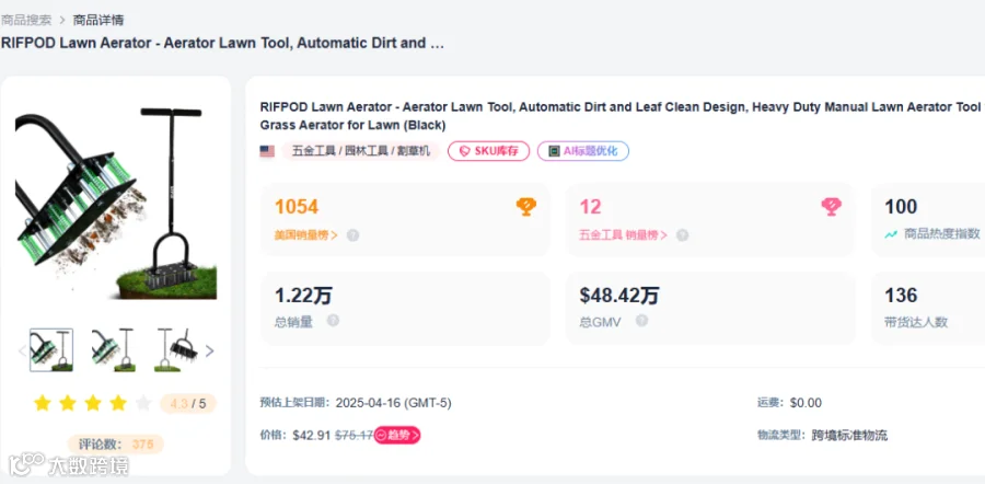 近期,TikTok美区五金工具类目销量榜中,一款草坪打孔器热度飙升。Fastmoss数据显示,该产品上线不到一个月即售出3000多件,跨境销售总额突破百万元,跃居TikTok美区园林工具类目热销榜首。