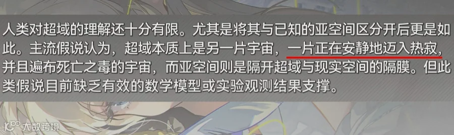 比如游戏设定上许多地方都能体现出比较缜密的科幻逻辑,像游戏设定中,关于“超域”的主流假说,显然就是基于热力学第二定律,也就是熵增原理进行的设计。