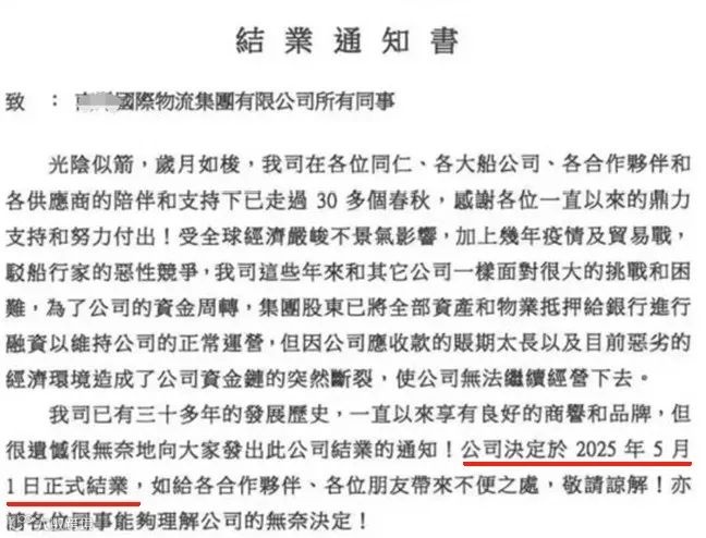 5月1日凌晨,一份冰冷的《结业通知书》在跨境物流圈投下重磅炸弹。扎根行业34年,拥有21家分公司的华南物流某巨头公司——突然宣布:“因资金链断裂,公司即日起结业,全员解散!