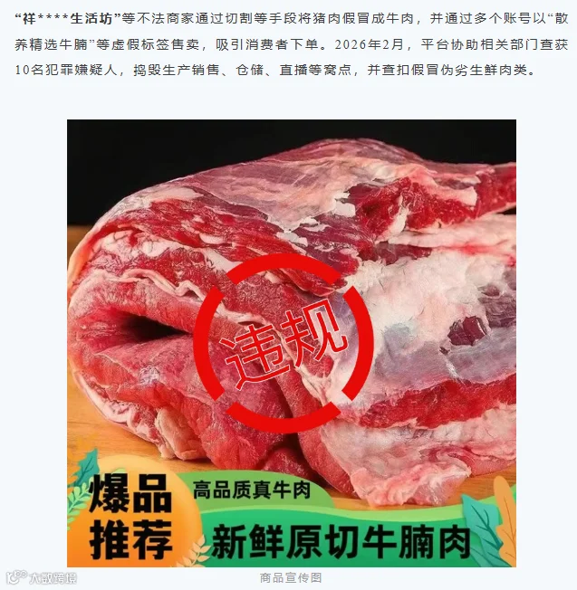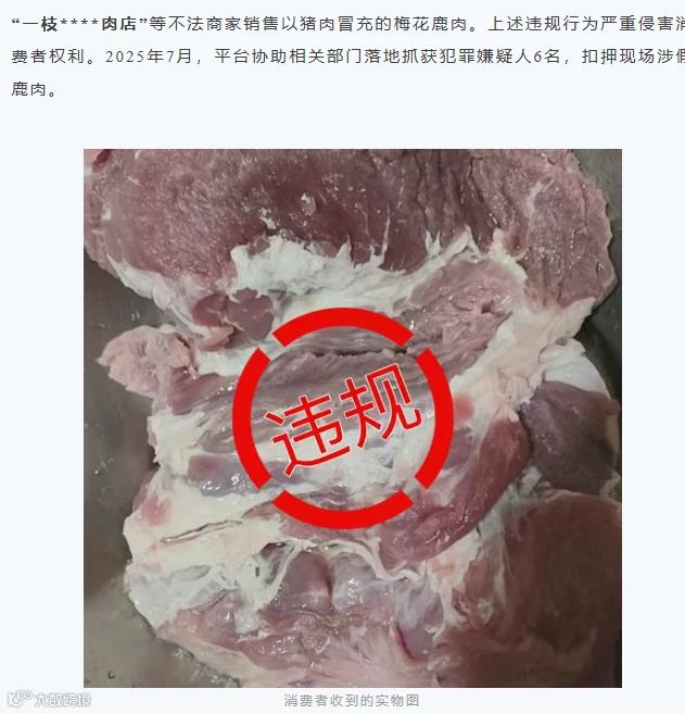不法商家用普通猪肉伪装“散养牛腩、野生鹿肉”售卖,平台协助抓获16名涉案人员,捣毁生产销售全链条。