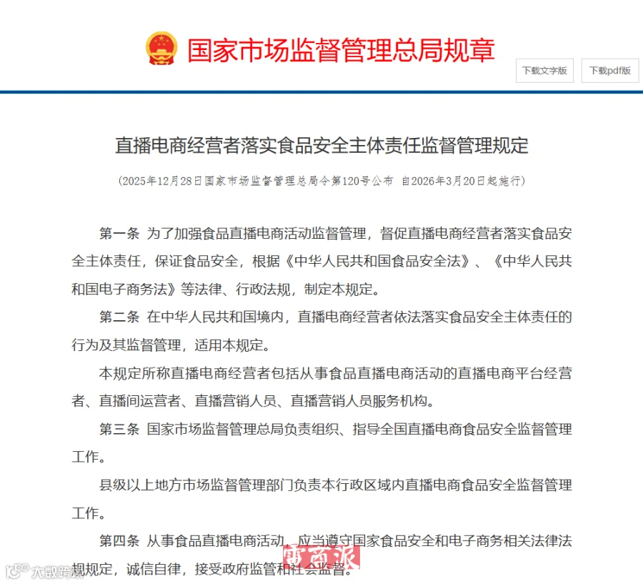 《直播电商经营者落实食品安全主体责任监督管理规定》已正式实施,将平台、直播间运营者等纳入全链条监管。