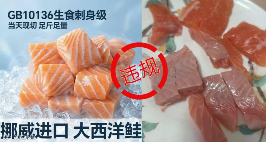 使用国产淡水虹鳟鱼冒充挪威进口三文鱼,存在虚假宣传和产品质量问题。