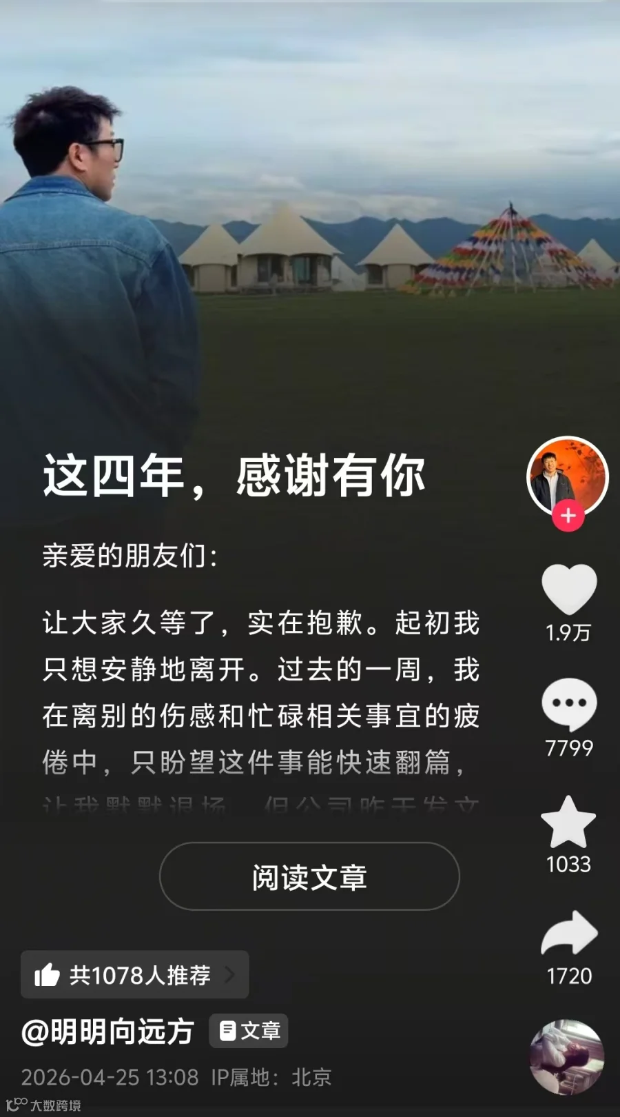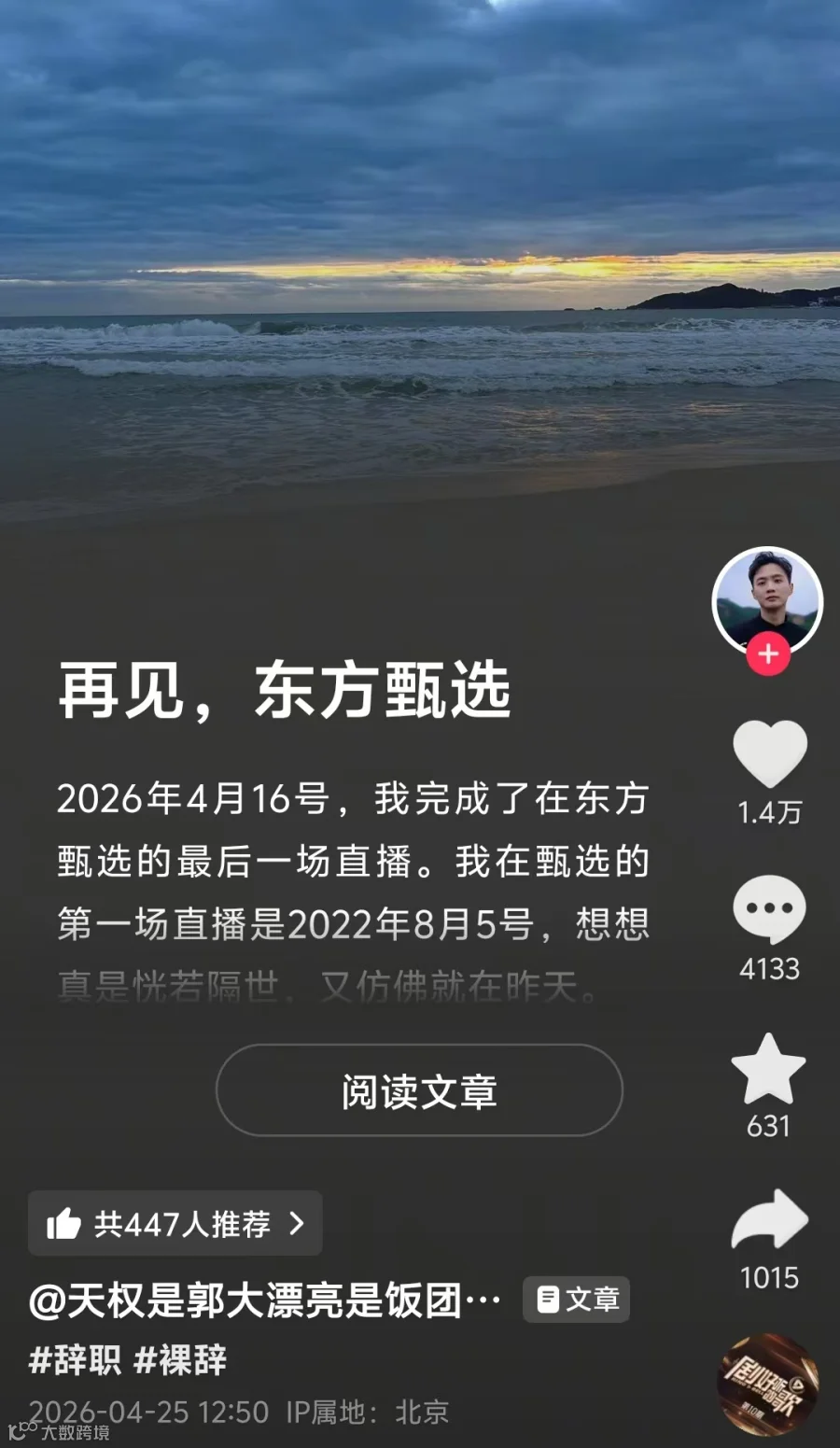公告题为"江湖路远,任君驰骋;一程山水,此间有情",称:"怀着遗憾和不舍的心情告知大家:主播明明和天权即将告别东方甄选。公司曾诚挚沟通挽留,但最终尊重其个人职业规划选择。"