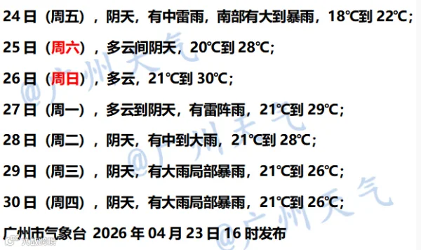 广州市气象台预计,4月24日受切变线维持影响,广州仍有中雷雨,南部有大到暴雨。4月25日—26日降水减弱,本周的双休日可能是未来10天内天气最好的一段时间。