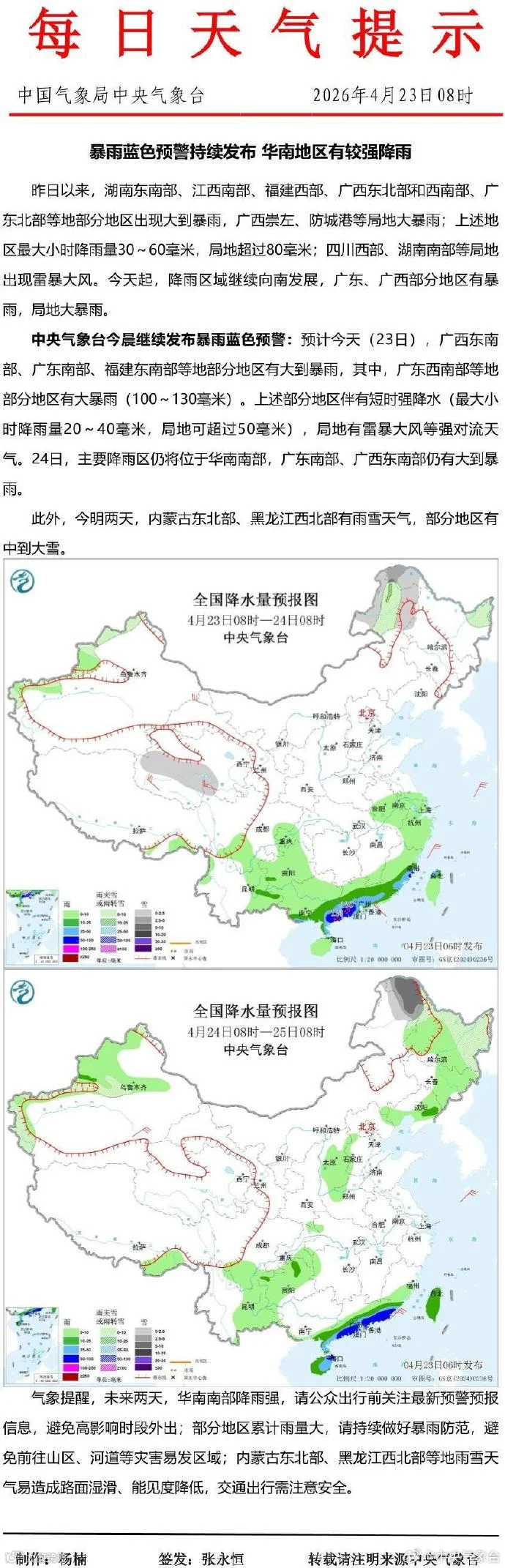 中央气象台4月23日8时继续发布暴雨蓝色预警:预计今天(23日),广西东南部、广东南部、福建东南部等地部分地区有大到暴雨,其中,广东西南部等地部分地区有大暴雨(100~130毫米)。上述部分地区伴有短时强降水(最大小时降雨量20~40毫米,局地可超过50毫米),局地有雷暴大风等强对流天气。24日,主要降雨区仍将位于华南南部,广东南部、广西东南部仍有大到暴雨。