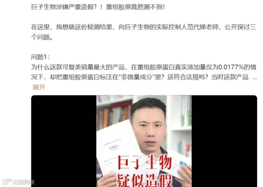 “大嘴博士”质疑巨子生物涉嫌造假 来源:网络