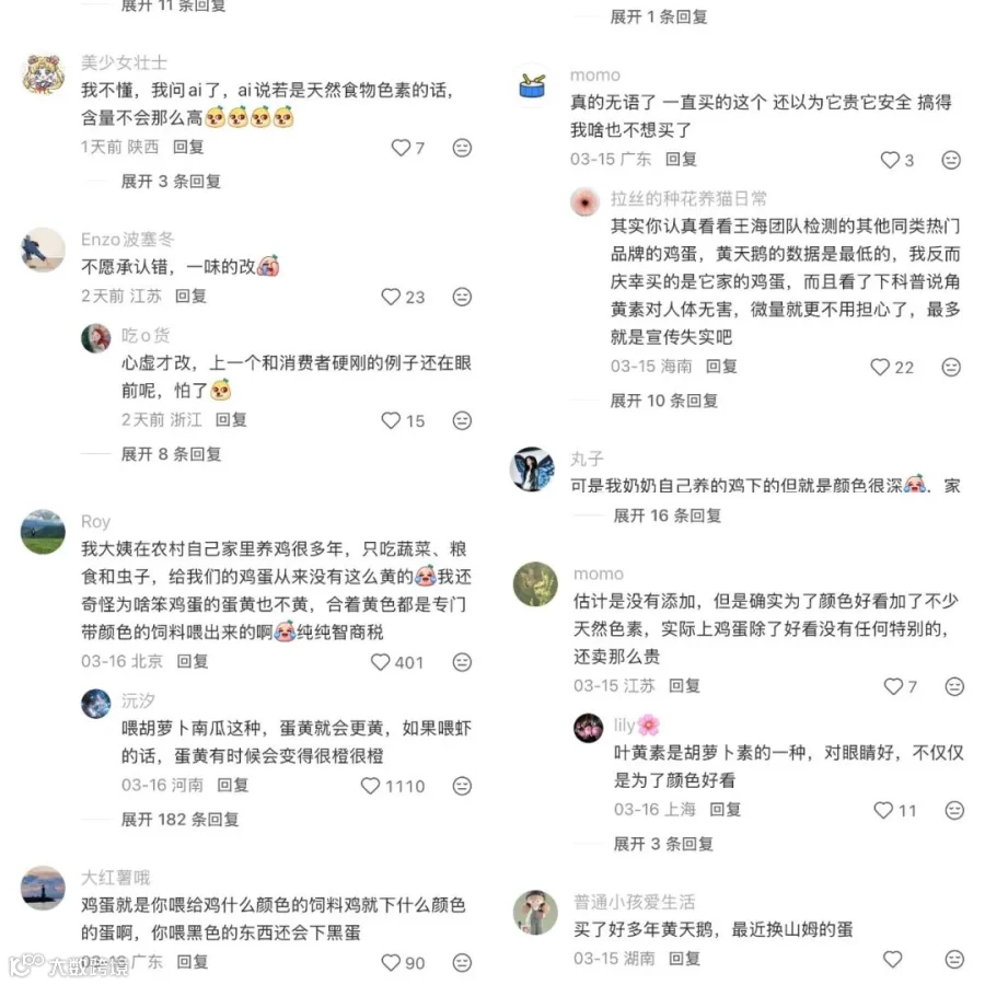 消费者逻辑极为朴素:“我花三四元买黄天鹅,是相信它因散养、好饲料而蛋黄更黄、更有营养。结果你为自证清白,列出一堆证据说明‘黄’来自合规饲料配比——那这高价,到底买的是鸡的健康,还是你的配方技术?”