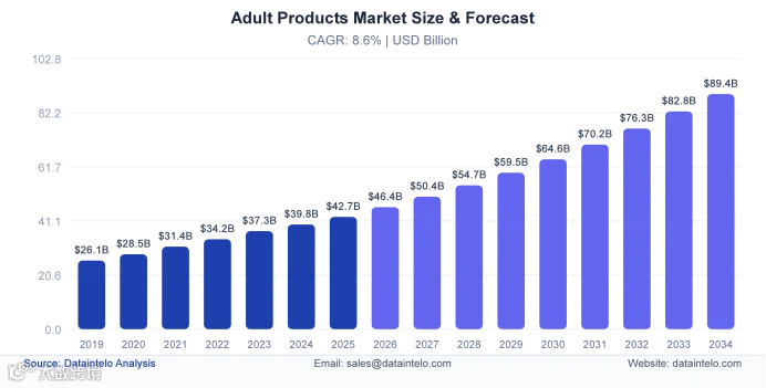 2025年全球成人用品市场规模预计达427亿美元,2034年将增长至894亿美元,2026-2034年复合年增长率8.6%。其中BDSM用品2024年规模8.4亿美元,2031年将超12亿美元,年复合增长率6.9%。美国市场2025年规模达23.5亿美元,预计2035年将增至51.5亿美元,年复合增长率8.16%。