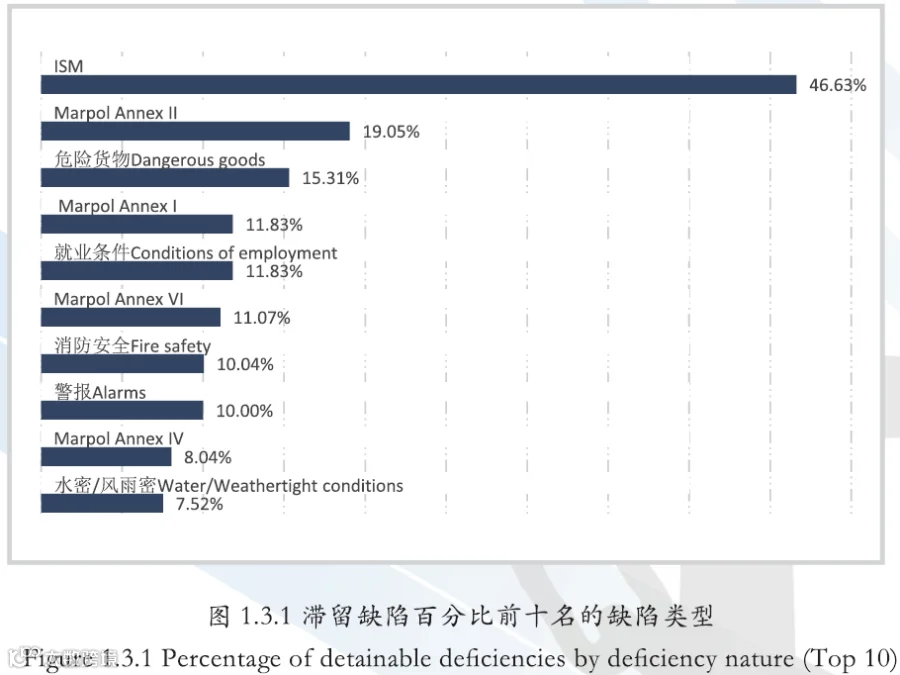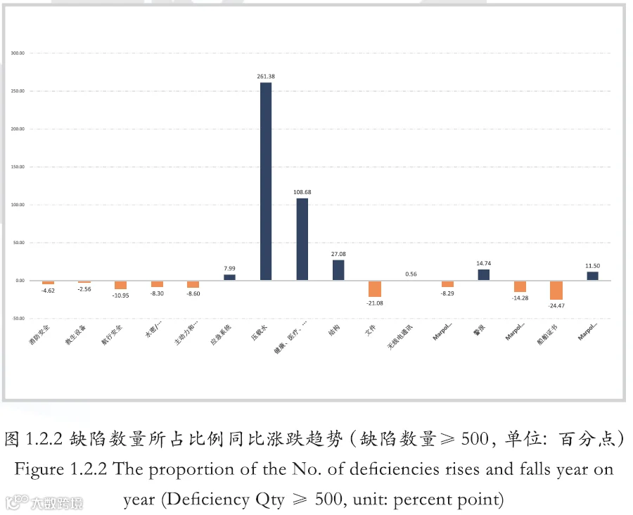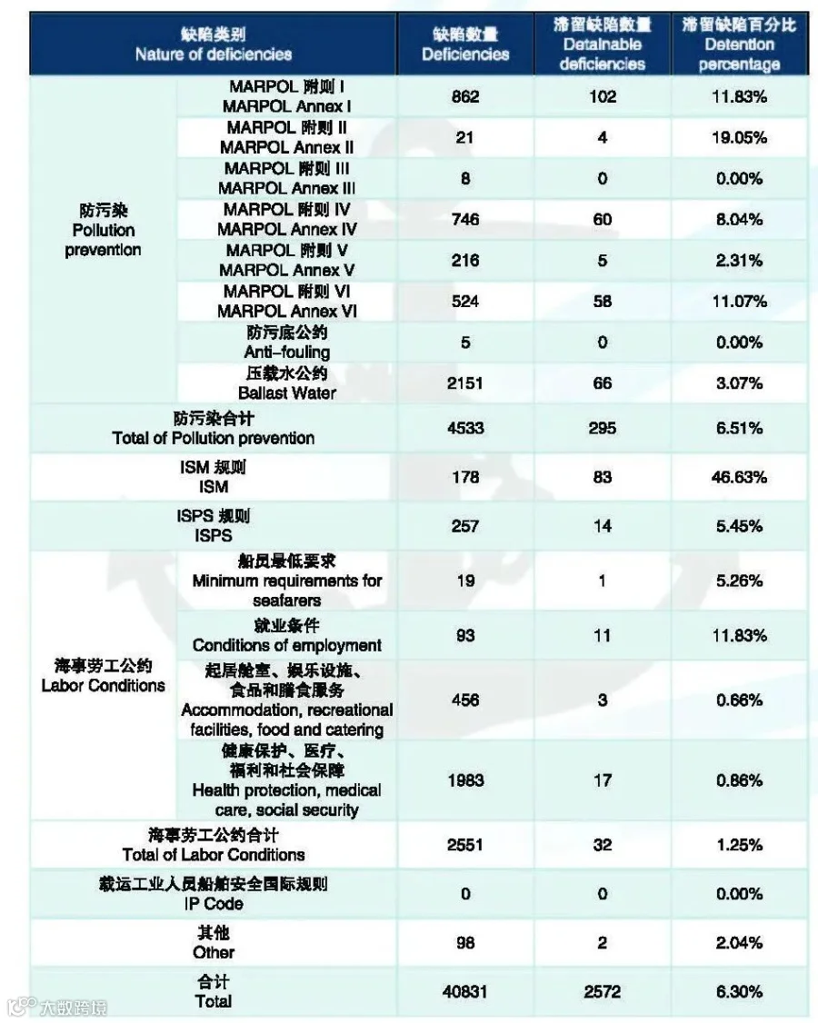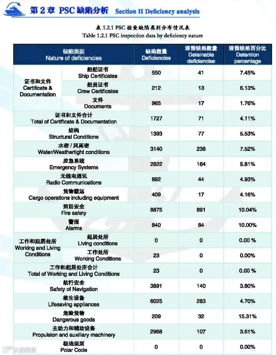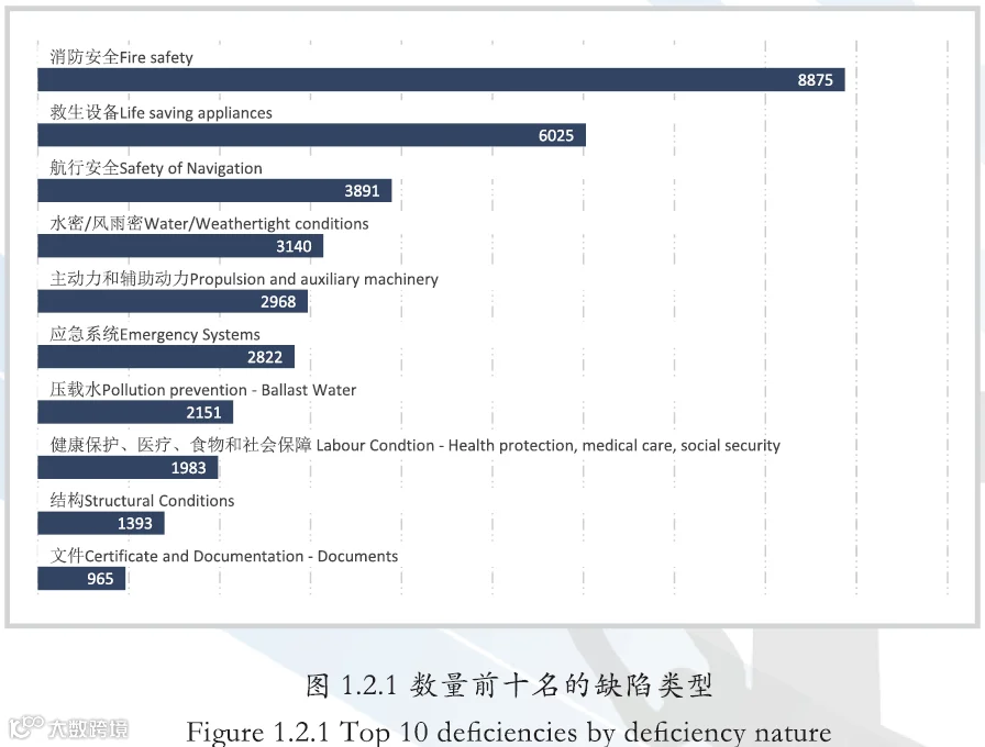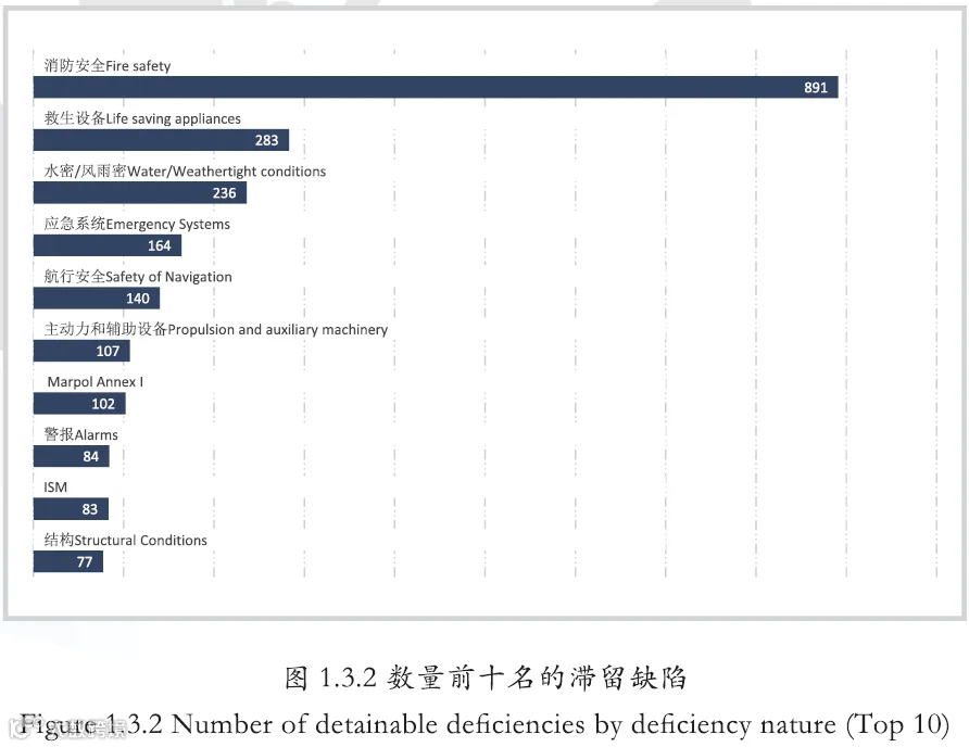 全年缺陷总数40831项,消防安全(8875项)、救生设备(6025项)、航行安全(3891项)占比最高。同比涨幅:压载水管理+261.38%、健康保护/医疗/福利+108.68%、结构缺陷+27.08%;证书类缺陷下降24.47%。