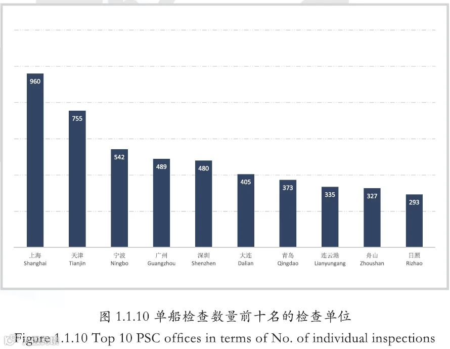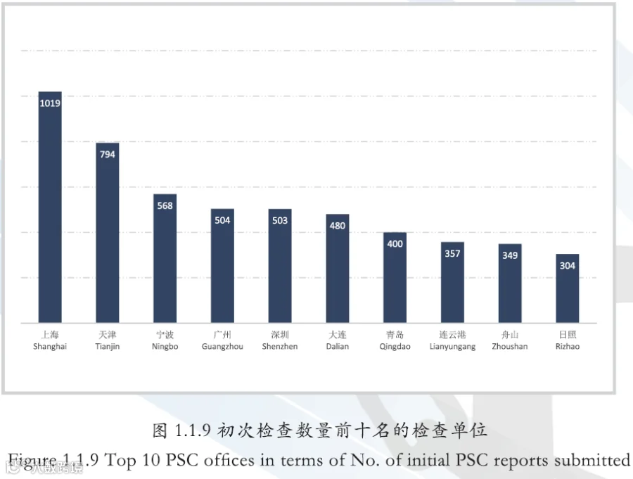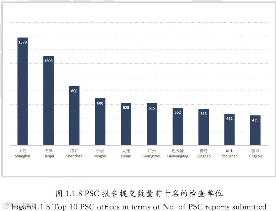 主要检查单位中,上海(1579份)、天津(1306份)、深圳(866份)提交报告总量领先;初次检查以上海(1019份)、天津(794份)、宁波(568份)为主,单船检查艘次上海(960艘)、天津(755艘)、宁波(542艘)最高。