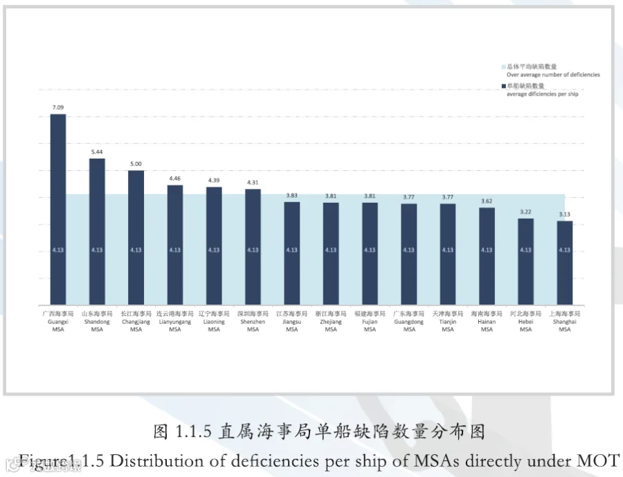 缺陷发现量山东(7278项)、广东(4379项)、浙江(4057项)位列前三位。单船平均缺陷4.13项,广西(7.09项)、山东(5.44项)、长江海事局(5.00项)高于全国均值。
