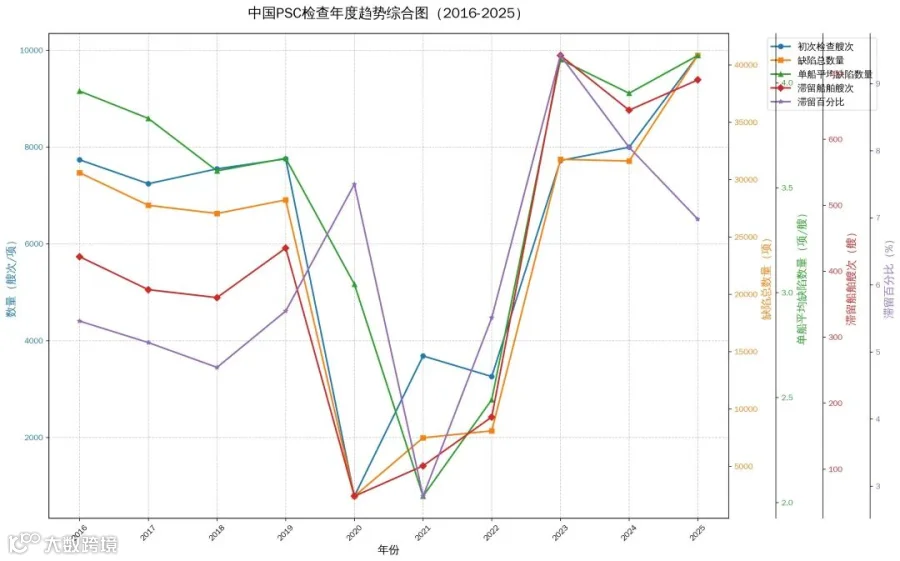 2025年,全国实施港口国监督(PSC)初次检查9892艘次,同比增23.71%;滞留外国籍船舶690艘次,同比增7.14%。亚太地区压载水管理集中检查中,开展专项检查2266艘次,发现缺陷942项。
