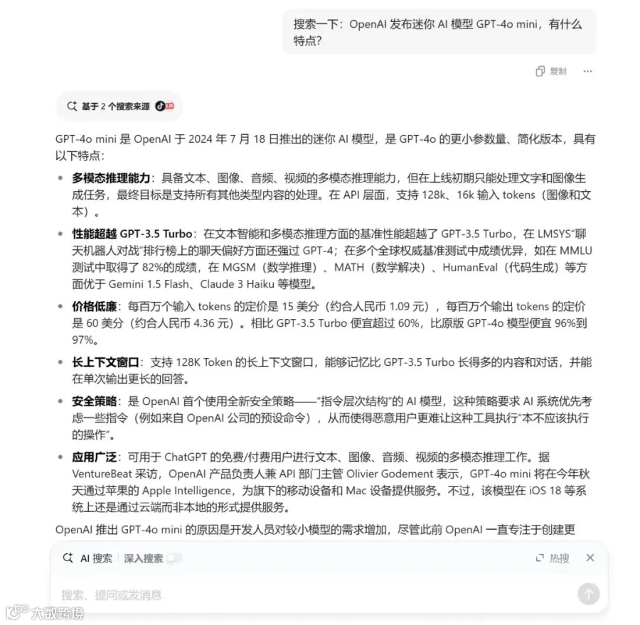 对话式搜索引擎,融合语言模型推理与实时网络检索,生成结构化精准回复。