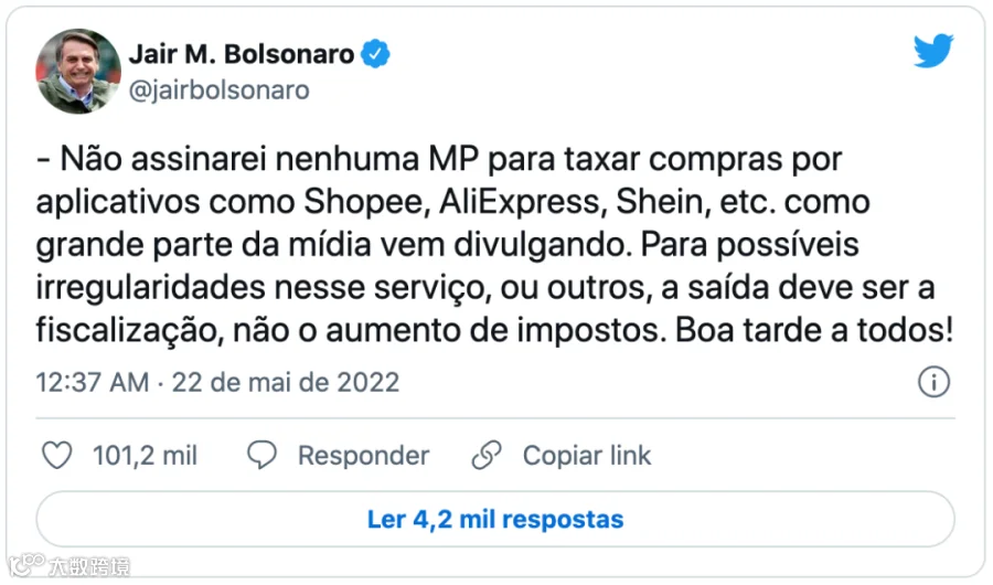 5 月 21 日,Jair Bolsonaro在Twitter 上写道:“我不会签署任何 MP(临时措施)来对 Shopee、AliExpress、Shein 等应用程序的购买征税,尽管许多媒体一直在宣传。”