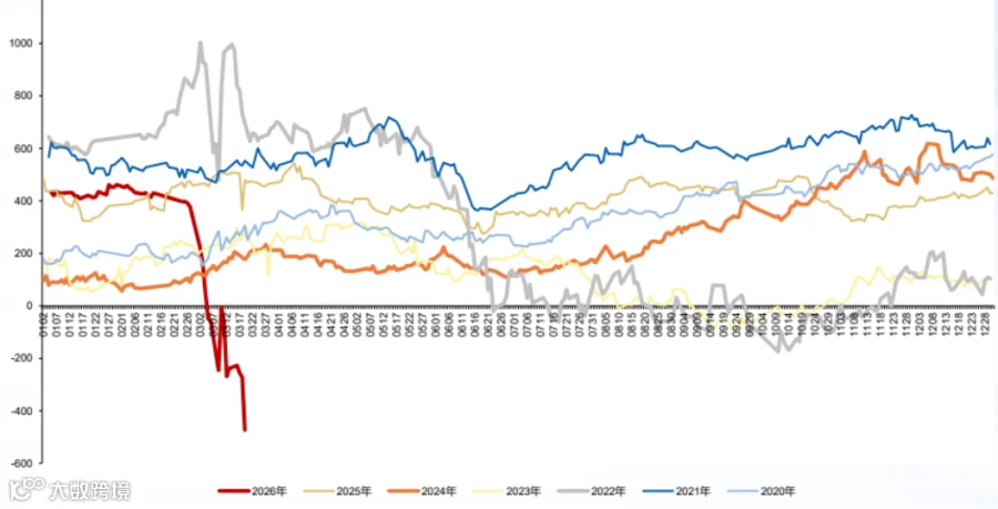 中东局势升级引发全球大宗商品市场恐慌情绪,原油作为核心品种,其风险溢价快速向油脂传导。本轮冲突中,布伦特原油大幅上涨,市场对供应短缺的担忧直接提振油脂多头情绪。2026年3月份以来,棕榈油期货涨9.8%、豆油涨5.11%、菜籽油涨6.8%,与原油价格走势高度同步。短期看,冲突持续将维持市场乐观情绪,油脂价格易涨难跌,若冲突进一步升级,原油溢价扩大,油脂将迎来新一轮上涨动力。