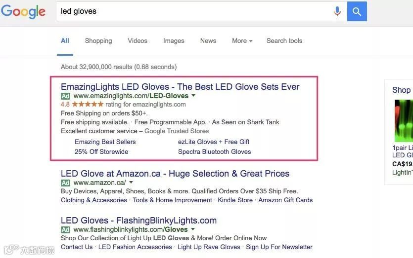 文字广告对于服务与其它无形产品来讲可能比较有用,但如果你卖的是实体产品的话,那么你最好选择Google购物广告。因为该广告使用了便于购买的界面模式显示产品图及产品价格,与文字广告相比,它显然更容易吸引注意力。