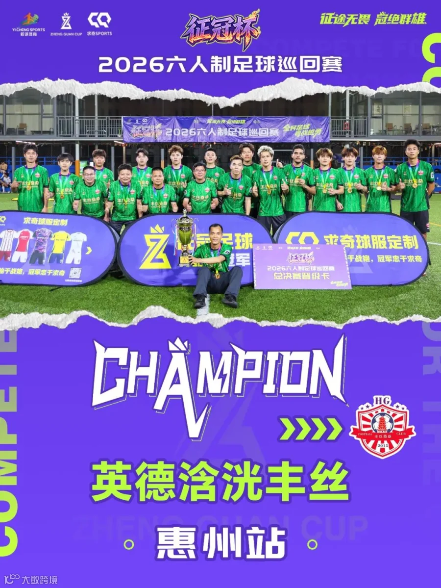 4月7日,2026征冠足球巡回赛广东惠州站在惠州日报足球公园圆满落幕。英德浛洸丰丝自预选赛起便展现出强劲实力与昂扬斗志,以6个积分与中山恒丰携手挺进正赛。赛场上,球队配合娴熟流畅,“王健林”组合发挥亮眼,一路过关斩将;正赛阶段更是双杀中山恒丰,以四战全胜的不败战绩傲视群雄,成功捧起冠军奖杯。恭喜英德浛洸丰丝斩获惠州站冠军,顺利拿下2026征冠总决赛参赛资格!