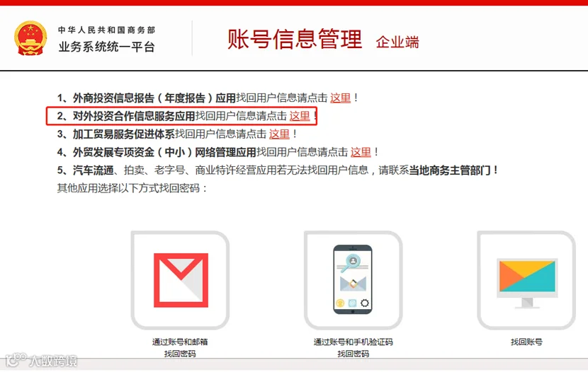 地方企业,选择“对外投资合作信息服务非电子钥匙用户”。