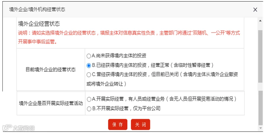 详见步骤四,在弹出页如实填报境外企业的经营状态。未获得境内主体投资和目前已关闭企业按实际情况选择后无需填报半年报。如境外企业已注销或关闭,请及时赴商务主管部门办理注销手续。