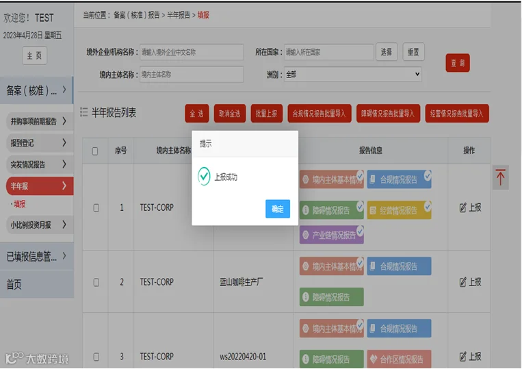 待报表均填写完毕,点击“上报”,即可报送信息。上报成功后,此境外企业将不在此列表中显示。已上报成功的半年报告无修改操作!