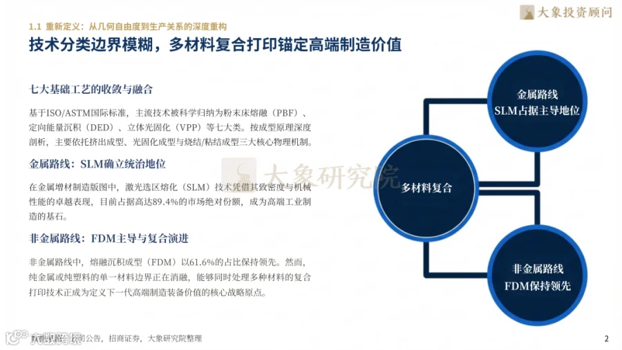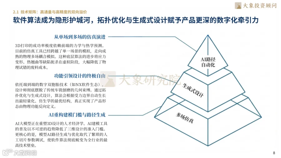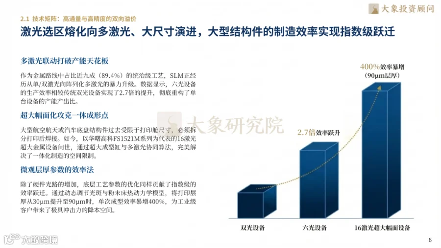 硬件、材料、软件技术形成协同突破:金属打印设备从单/双激光升级至阵列化多激光,六光设备效率提升2.7倍;打印层厚从30μm增至90μm,单次成型效率激增400%。BJT粘结剂喷射技术突破金属量产成本临界点,多场耦合仿真与AI建模将结构设计周期从数天压缩至分钟级。