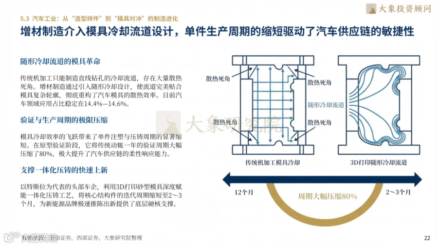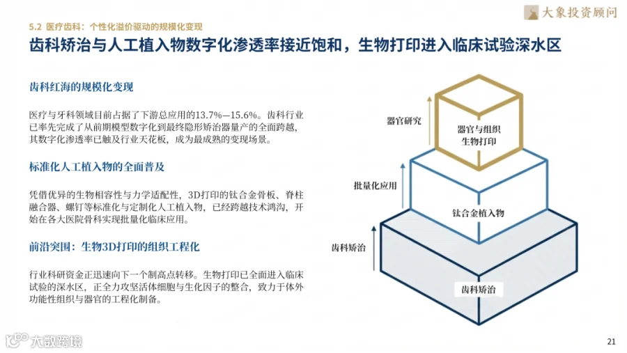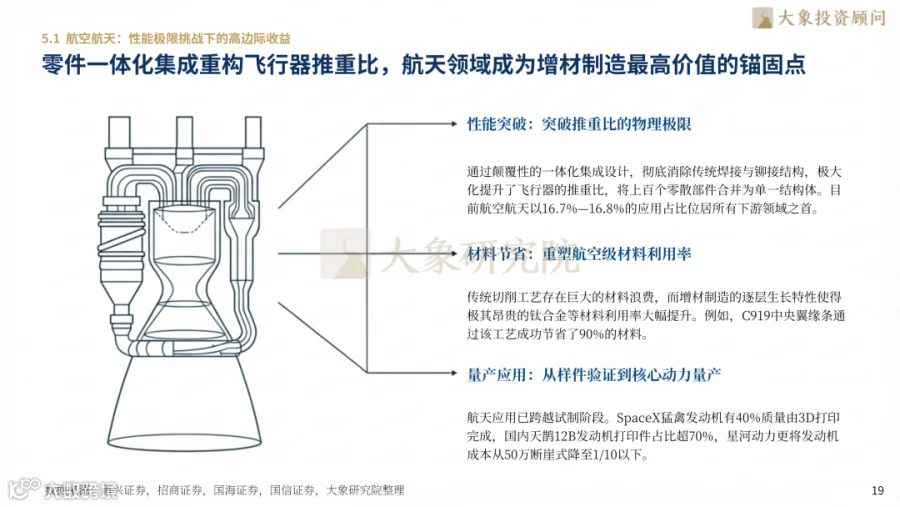 航空航天以16.8%占比居首,C919中央翼缘条材料利用率提升90%,SpaceX发动机40%质量由3D打印完成。医疗齿科渗透率达15.6%,钛合金植入物批量临床应用。汽车领域应用占比14.6%,随形冷却流道压缩模具验证周期80%,特斯拉、宝马等将3D打印作为轻量化核心手段。