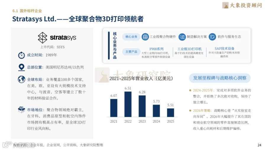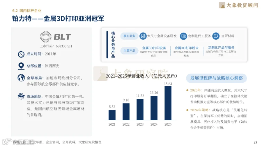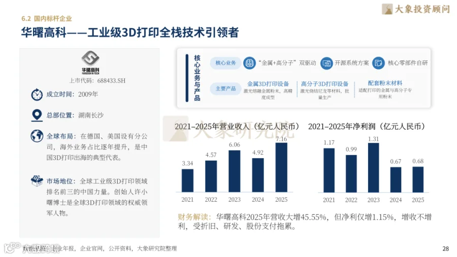 国际格局中:Stratasys为聚合物打印霸主(2025年营收6.51亿美元),3D Systems专注生物医疗,EOS占据工业金属打印超40%市场份额。国内龙头:铂力特为亚洲金属打印冠军(2025年营收18.63亿元),华曙高科实现金属+高分子双赛道突破,创想三维居消费级全球首位。