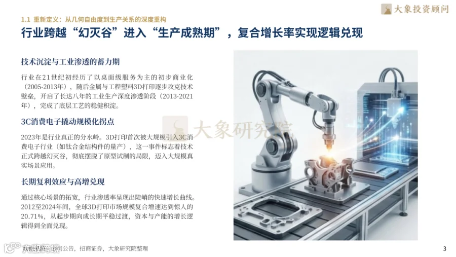 3D打印实现几何自由度突破与生产关系重构,SLM金属技术以89.4%市占率成主导,FDM非金属技术占比61.6%。2012-2024年全球市场规模复合增速20.71%,2023年3C消费电子规模化应用成行业分水岭。2026年3D打印确立为全球供应链核心生产力,分布式制造重塑零库存供应链,材料利用率显著提升。