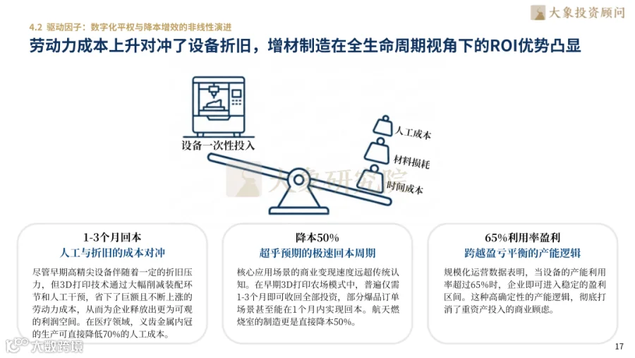利润中心从硬件向材料、服务转移,上游粉末供应商利润率提升20.1%。中游设备商向MaaS(制造即服务)转型,打印服务占比超46%,全球设备集群规模达15000台。下游JIT模式实现零时差供应,设备利用率超65%即可稳定盈利,医疗齿科与航天制造降本50%-70%,1-3个月回本。