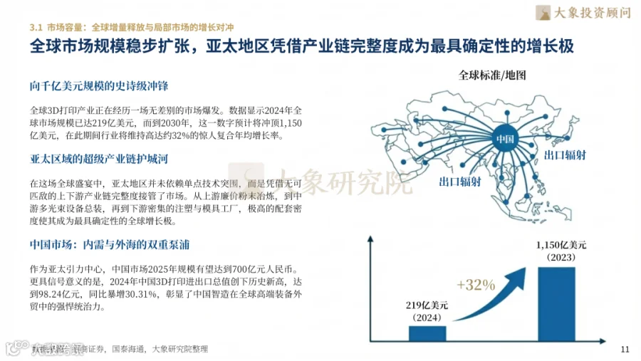 2024年全球3D打印市场规模达219亿美元,预计2030年冲顶1150亿美元(CAGR 31%)。中国2025年市场规模将达700亿元,2024年进出口总值98.24亿元、同比增30.31%。工业级设备占比74%,2025年国内设备产量521.1万台(同比增52.5%)。工业级市场CR5达35.5%,Stratasys以11.5%份额领跑全球。