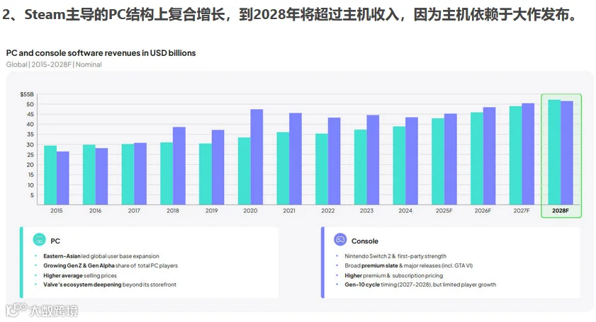 2028年全球PC玩家基数将突破10亿大关,其软件收入也将历史性地反超主机市场