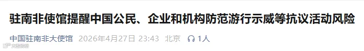 中国驻南非大使馆27日发布信息,提醒中国公民、企业和机构防范游行示威等抗议活动风险。全文如下: