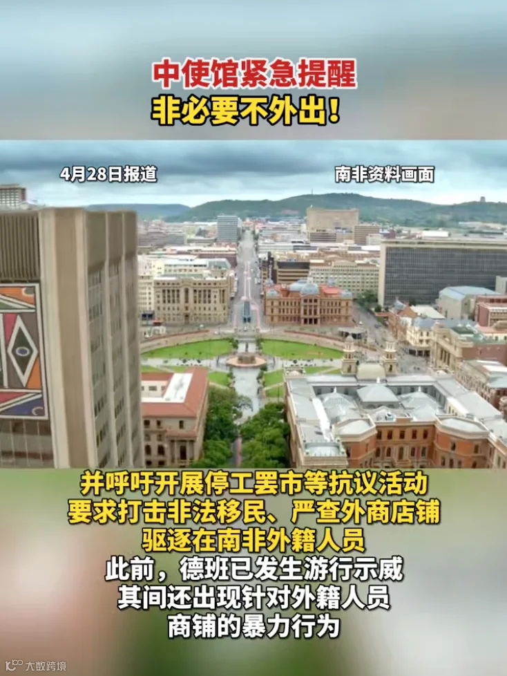 据当地媒体报道,有南非民间组织计划近期在约翰内斯堡、比勒陀利亚等多地组织排外游行示威,并呼吁开展停工罢市等抗议活动,要求打击非法移民、严查外商店铺、驱逐在南非外籍人员。此前,德班已发生游行示威,其间还出现针对外籍人员、商铺的暴力行为。