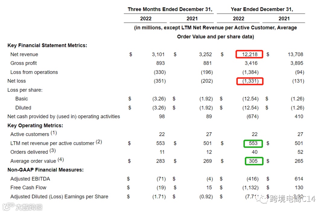 Wayfair2022年财报出炉,不出所料财务数据进一步下滑。营收122亿美元,同比下降10%,其中美国市场下降7%,欧洲市场下降29%。毛利34亿美元,净亏损13亿美元,而2021年净亏损1.3亿美元