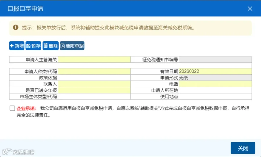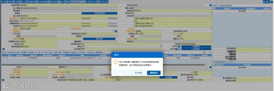 - 勾选企业承诺后暂存数据,选择手动或辅助提交方式(辅助提交在报关单放行后自动传输数据)