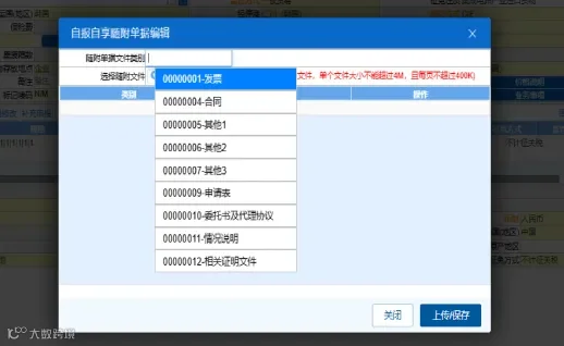 01发票、04合同、09申请表、11情况说明为必传项,缺失将导致审核需补传材料。报关单已传附件可自动抓取复用。