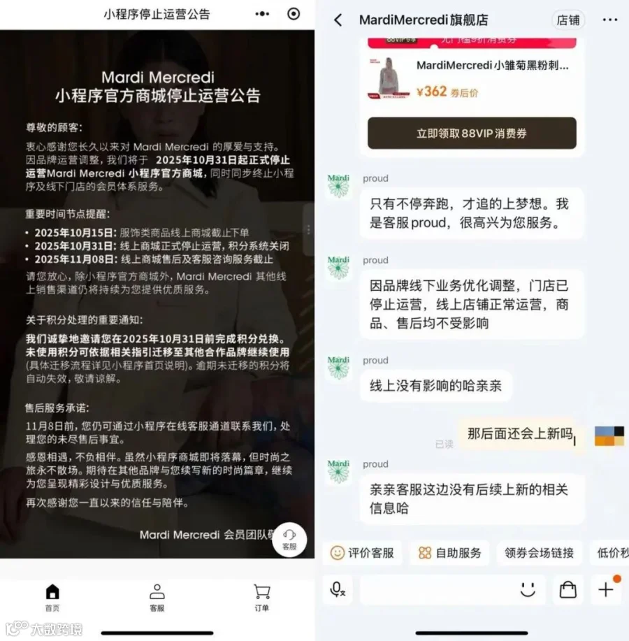 韩国设计师品牌Mardi Mercredi(曾以小雏菊和腊肠狗图案走红)正加速退出中国市场。该品牌已关闭中国所有线下门店,淘宝、抖音旗舰店首页显示终止营业,商品链接均被下架,无法通过关键词搜索。店铺公告显示,因全渠道业务调整,4月20日正式停止运营。