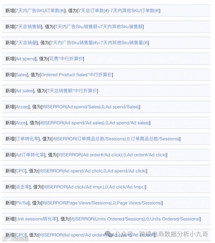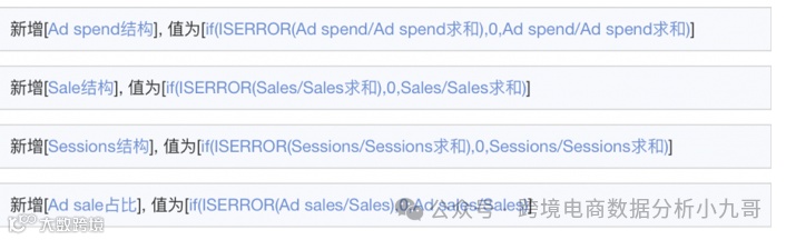 例如,计算某ASIN销售额占整体比例。可先统计总广告支出、总销售额和总访问量,再新增列进行比值赋值: