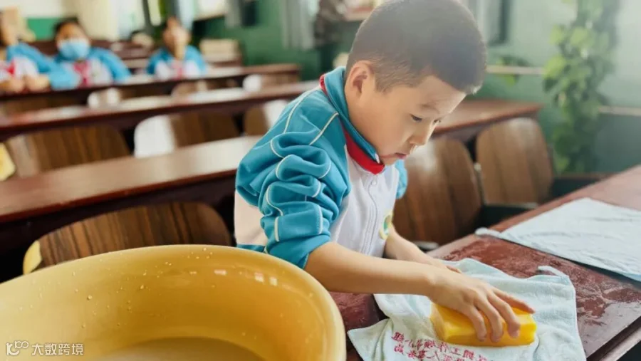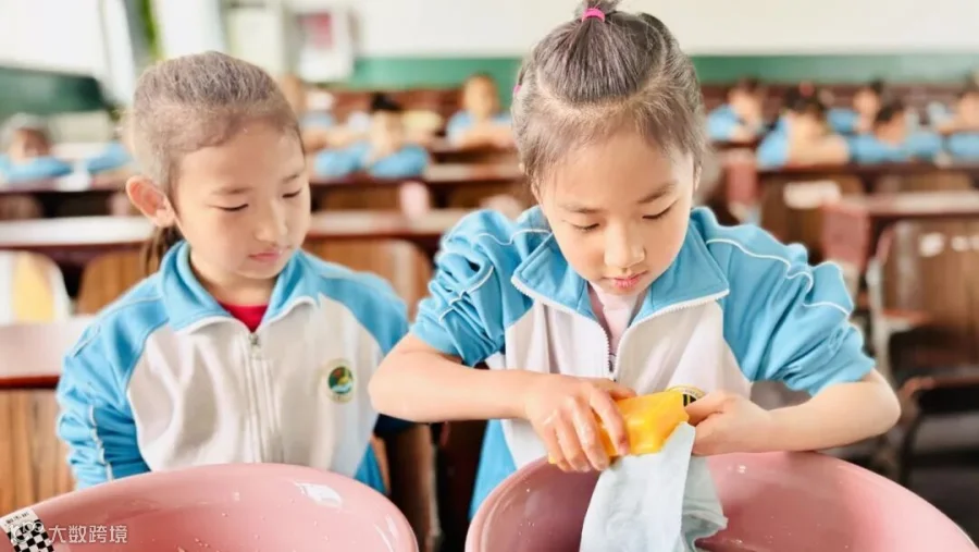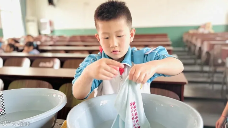 在“洗手绢”劳动技能比赛现场,一二年级的参赛选手们按照操作流程以接力形式清洗带有污渍的两块手绢,并完成台面清洁。在比赛过程中,选手们配合默契,把手绢洗得干干净净。瞧,他们洗得多认真!